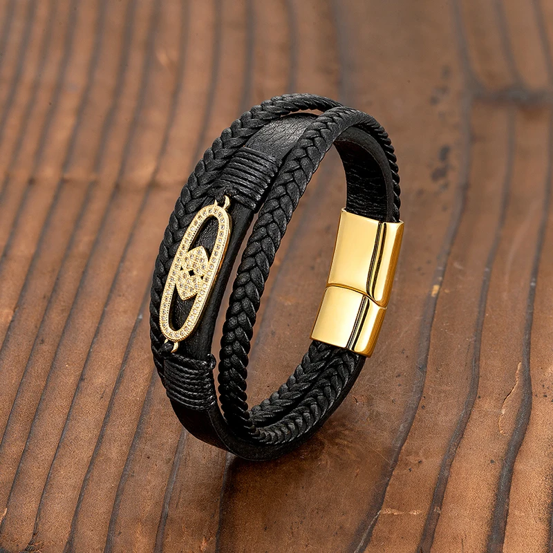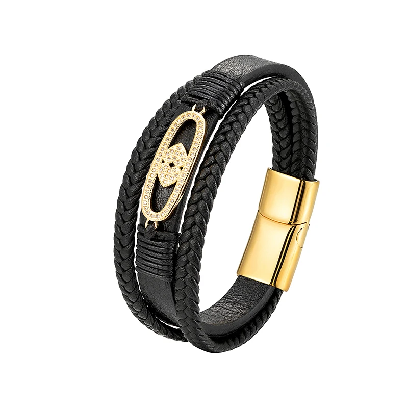 2021 new fashion design micro diamond 3-layer leather cord neutral bracelet stainless steel charm hand row