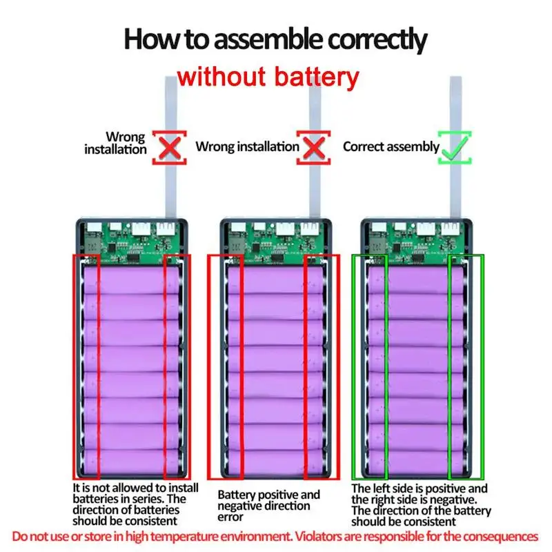 Note:Only 18650 flat-head batteries can be used, and the voltage is in line with 3.2V-4.2V. You need to use brand new batteries. Old batteries and damaged batteries will cause failure to work, incorrect connection of positive and negative poles, and the first time you need to use the battery full