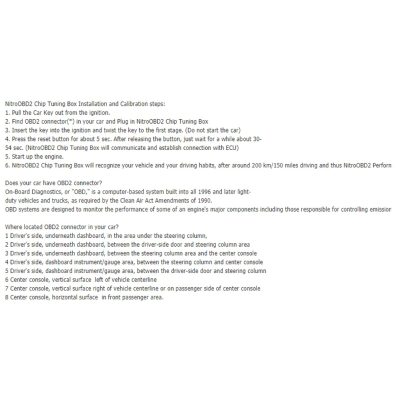 При подключении к разъему OBD2 Nitro OBD2 получает информацию от автомобильного компьютера ECU. С полученными данными от ECU нитро OBD2 регулирует повышающее давление, количество топлива, время впрыска и давление, чтобы увеличить производительность вашего автомобиля.