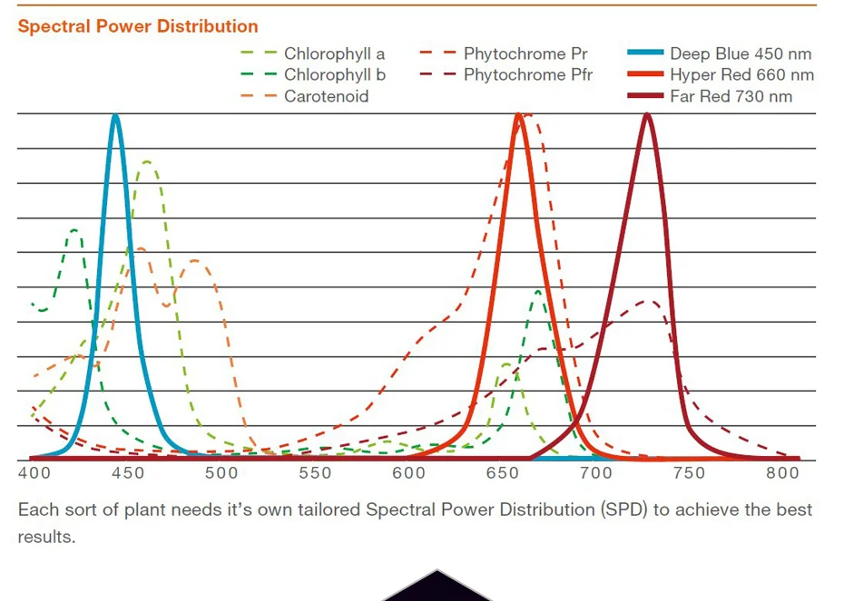 620нм ~ 750нм (красный) Скорость поглощения хлорофилла "Высокая", оказывает значительное воздействие на фотоссинтез и фотопериод эффект.