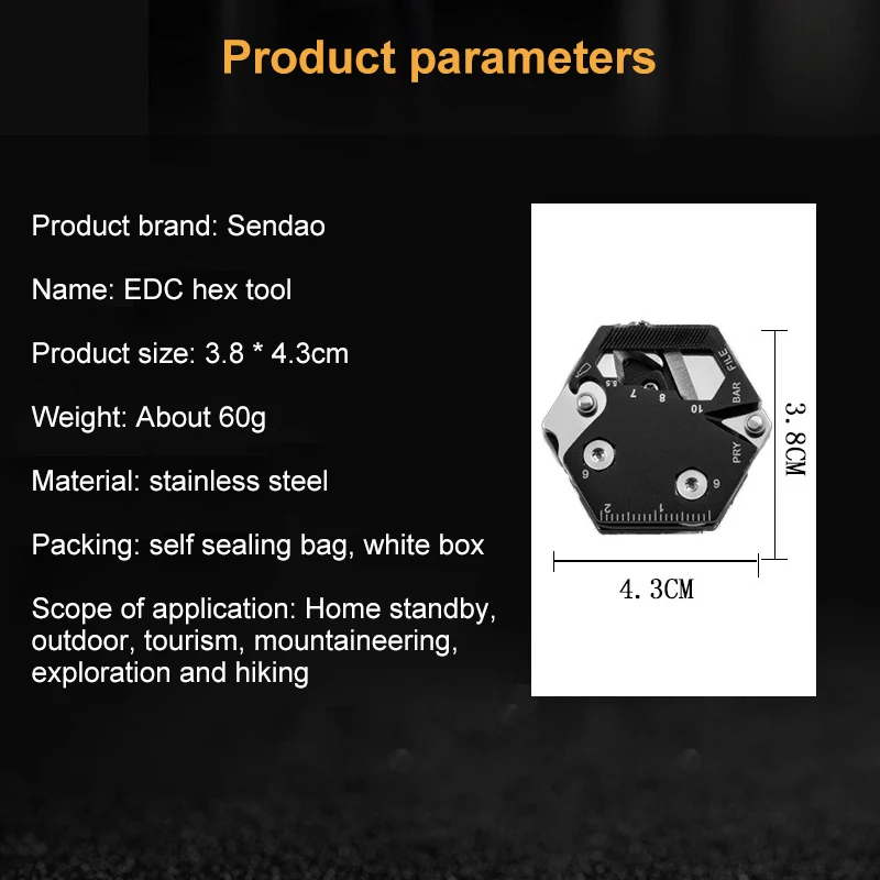 Этот Многофункциональный гаджет был разработан в уникальной шестигранной форме в современной моде. Он оснащен множеством функций, чтобы дать вам все в одном инструменте удобно, когда вам это может понадобиться. Это небольшое приспособление может предложить много. Включает в себя складной нож, аварийный резак ремня безопасности, набор отверток, черную многоинструментальную карту с функциями, такими как линейка, шестигранный ключ, открывалка для бутылок, файл, резец резьбы и гвоздь съемник.