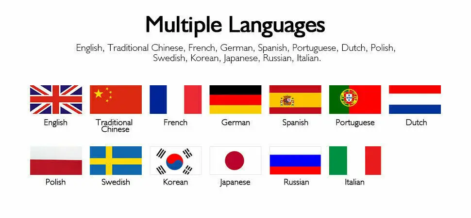 3. Поддержка 12 языков: английский, испанский, французский, немецкий, польский, итальянский, японский, корейский, голландский, португальский, шведский, русский. (Пожалуйста, оставьте номер S/N машины, чтобы авторизовать язык, который вы хотите получить после его получения.)