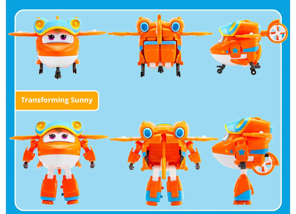 Соберите всю линейку членов команды Super Wings (продается отдельно)! Выберите Jett, Dizzy, Donnie, Paul, Sunny, Leo и многое другое, каждый из которых превращается в совершенно уникальное транспортное средство от самолета до вертолета или грузовика.