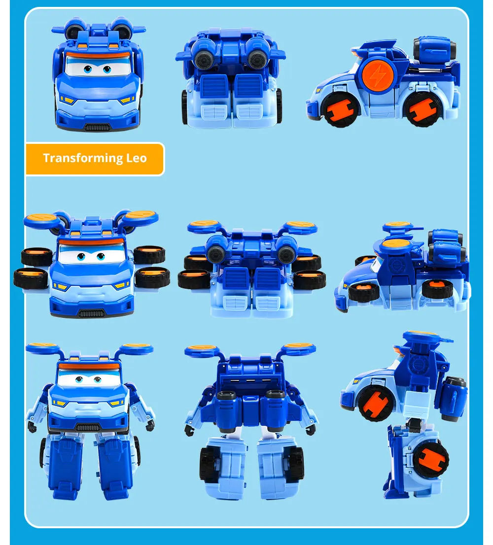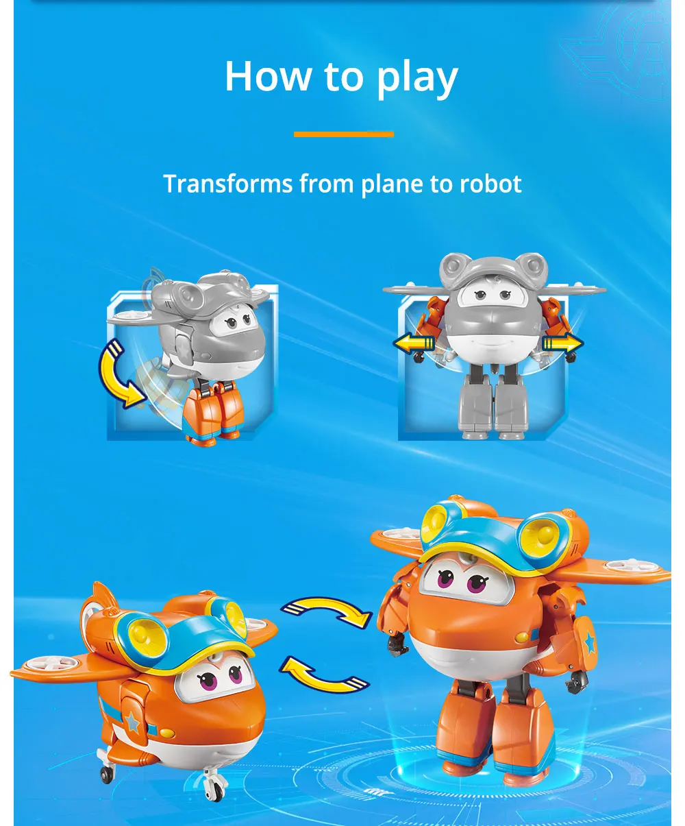 Соберите всю линейку членов команды Super Wings (продается отдельно)! Выберите Jett, Dizzy, Donnie, Paul, Sunny, Leo и многое другое, каждый из которых превращается в совершенно уникальное транспортное средство от самолета до вертолета или грузовика.