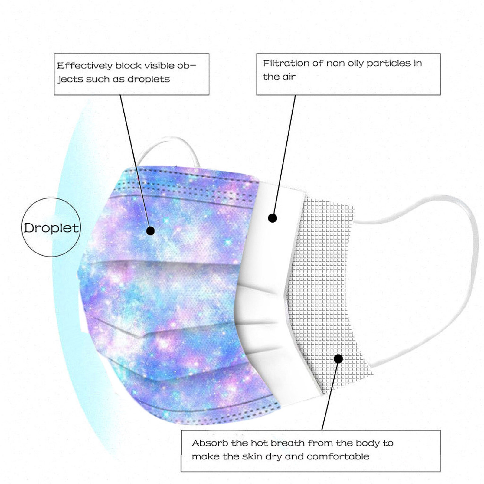 3 слоя Нетканая одноразовая маска изготовлена из 3 слоев нетканого материала, он безопасен для здоровья и безопасный для вас, чтобы использовать. Дышащий материал и милые узоры, что делает его полезным и модным. Специальный 3 слоя из нетканого материала, дизайн, обеспечивает некоторые меры защиты от пыли, автомобильный отходящий газ, пыльцу и т. Д. Эластичная петля уха позволяет легко снимать и надевать цепочку и не давит на уши. Маникюрный салон или любые другие области, где может потребоваться защита