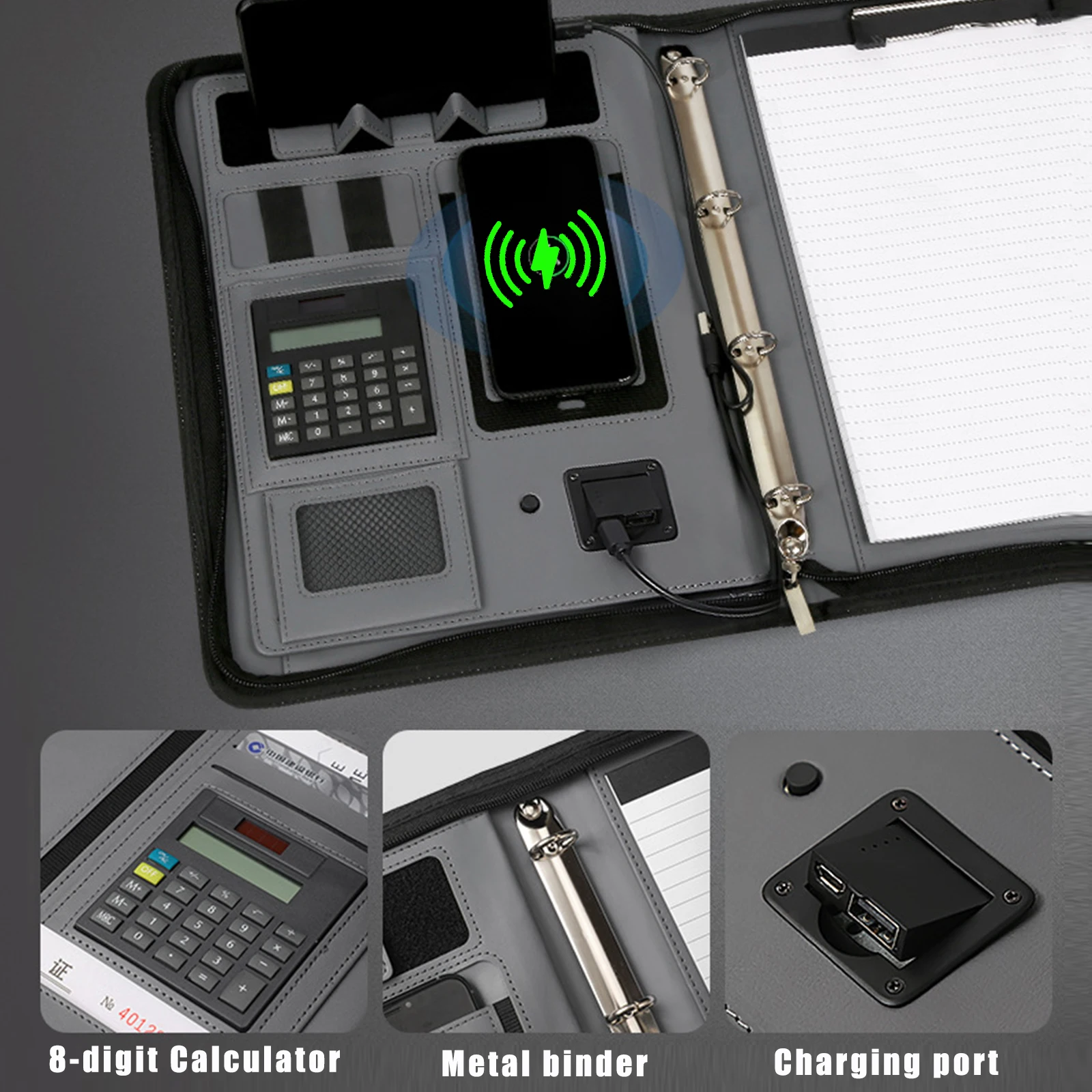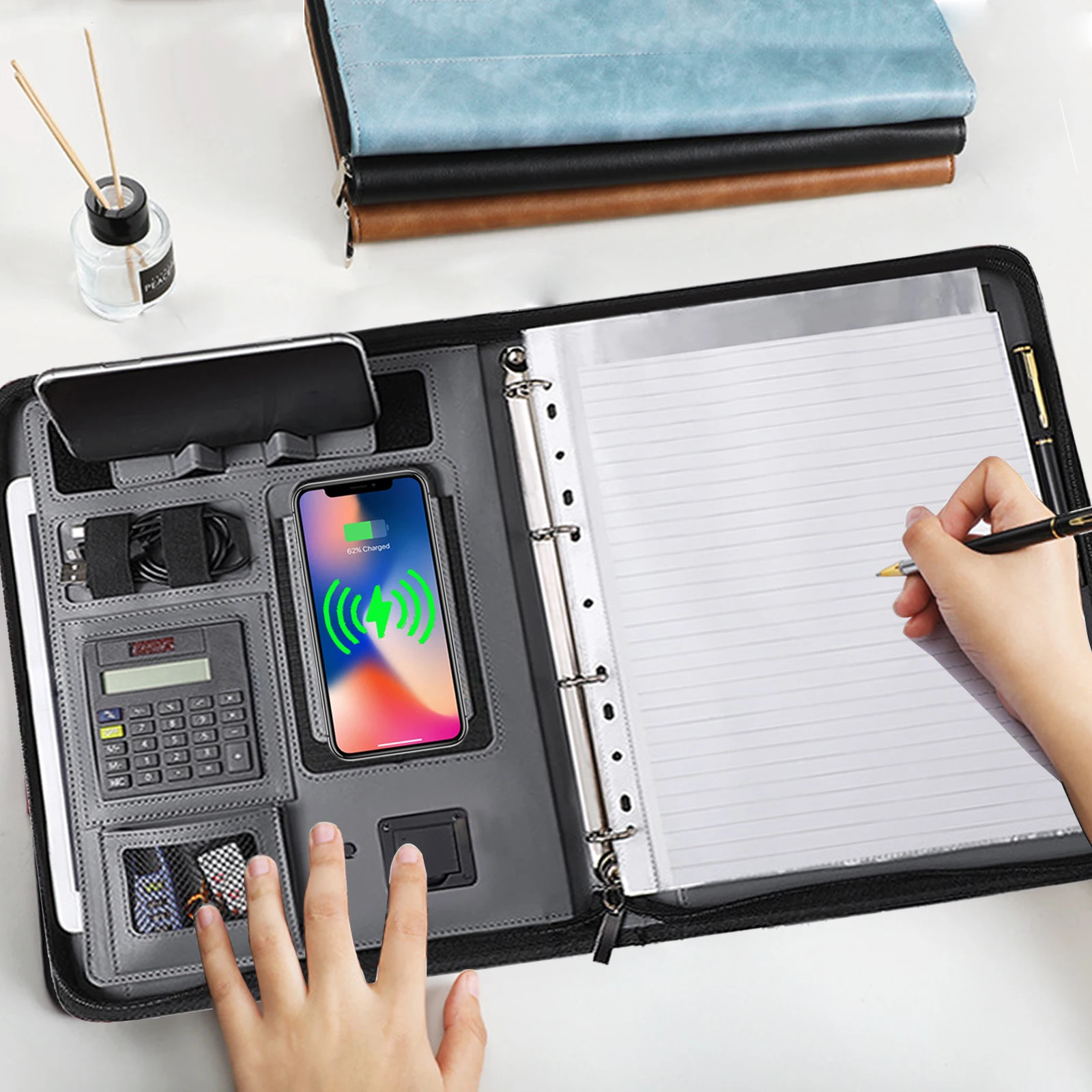 Падфолио папка, А4 многофункциональный беспроводной/проводной зарядки Портфолио органайзер, с ноутбуком, калькулятор, банк питания для телефона, для офиса бизнеса