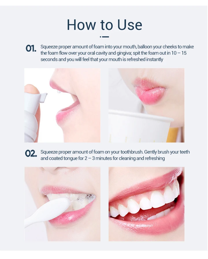 01. Вдавливайте необходимое количество пены в рот, Надавливайте на щеки, чтобы пена текла через полость рта и гингиву; выплюните пену за 10 - 15 секунд, и вы почувствуете, что ваш рот мгновенно обновится