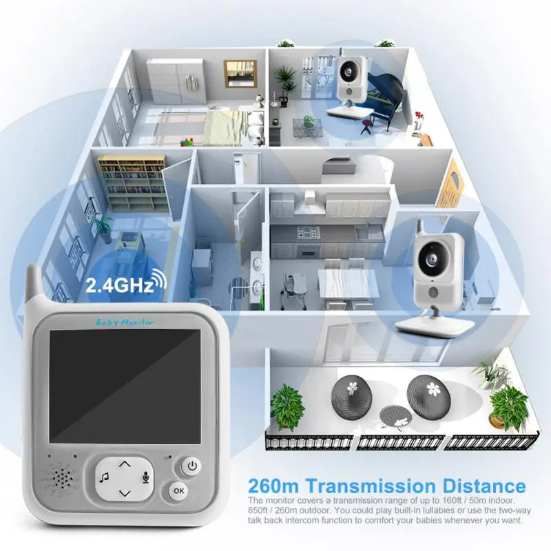 -Монитор обеспечивает дальность передачи до 160 футов/50 м внутри помещения, 850 футов/260 м снаружи. Вы можете играть в встроенные колыбельные или использовать функцию двусторонней обратной связи для комфорта ваших детей, когда захотите