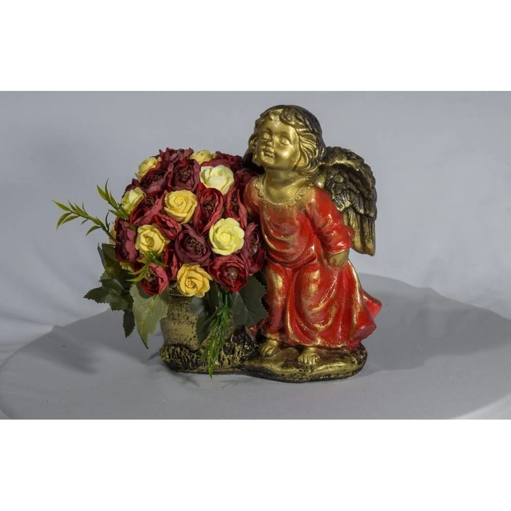 Композиция выполнена в виде ангелочка с букетом красных и желтых цветов.