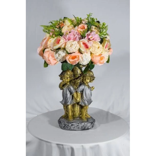 Композиция состоит из золотых и серебряных ангелов, которые держат в руках цветы.