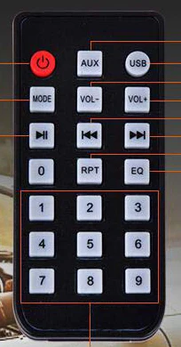 Кнопки дистанционного управления: 1. Кнопка ввода аналогового сигнала AUX, 2. Кнопка ввода флеш-накопителя USB, 3. Режим два набора кнопок Переключения источника звука, 4. RPT кнопки переключения одноциклового и последовательного воспроизведения.
