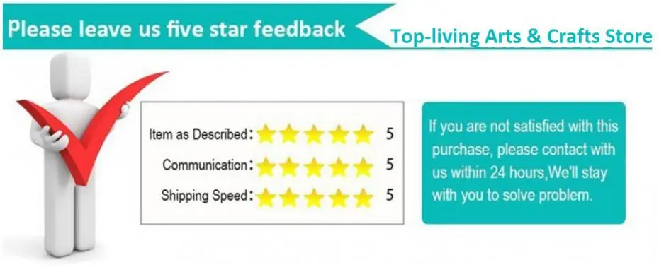 1. Ваше удовлетворение, наша цель. Мы оставим положительотзывы в всем покупателям после завершения заказа. Если вы удовлетворены нашими товарами и обслуживанием, пожалуйста, не забудьте оставить нас Положотзывы в и Оценка 5 баллов;2. Уважаемый клиент, обратная связь очень важна. Если вы Доволен С Наши товары и услугиПожалуйста, оставьте положительный отзывы в о нас. Если вы недовольны им, Пожалуйста, свяжитесь с нами (Электронная почта, оставьте сообщение на Aliexpress) перед тем, как оставить отрицательный или нейтральный или оценку 1 или 2. Мы будем Попробуйте сделать все возможное, чтобы решить Это Ваш удовлетворительный И сделайте покупки здесь приятными.