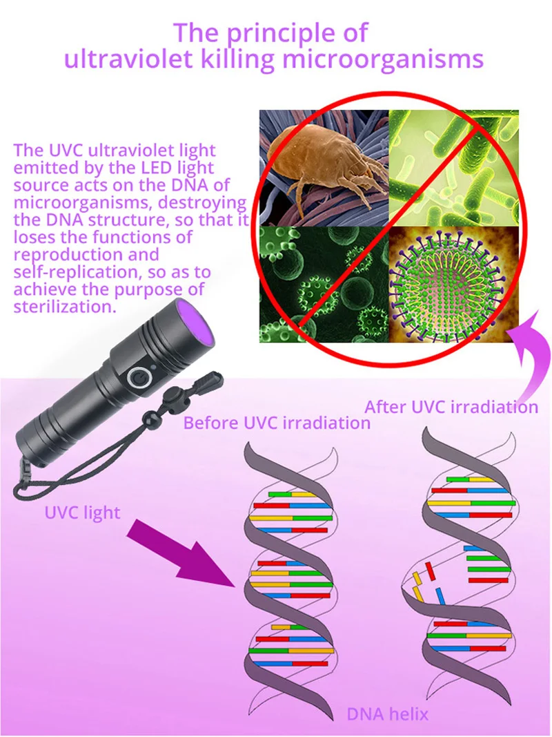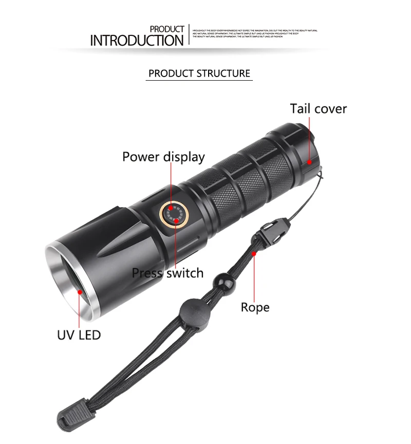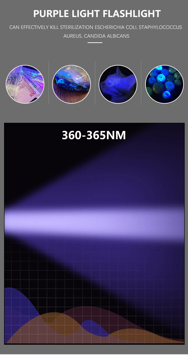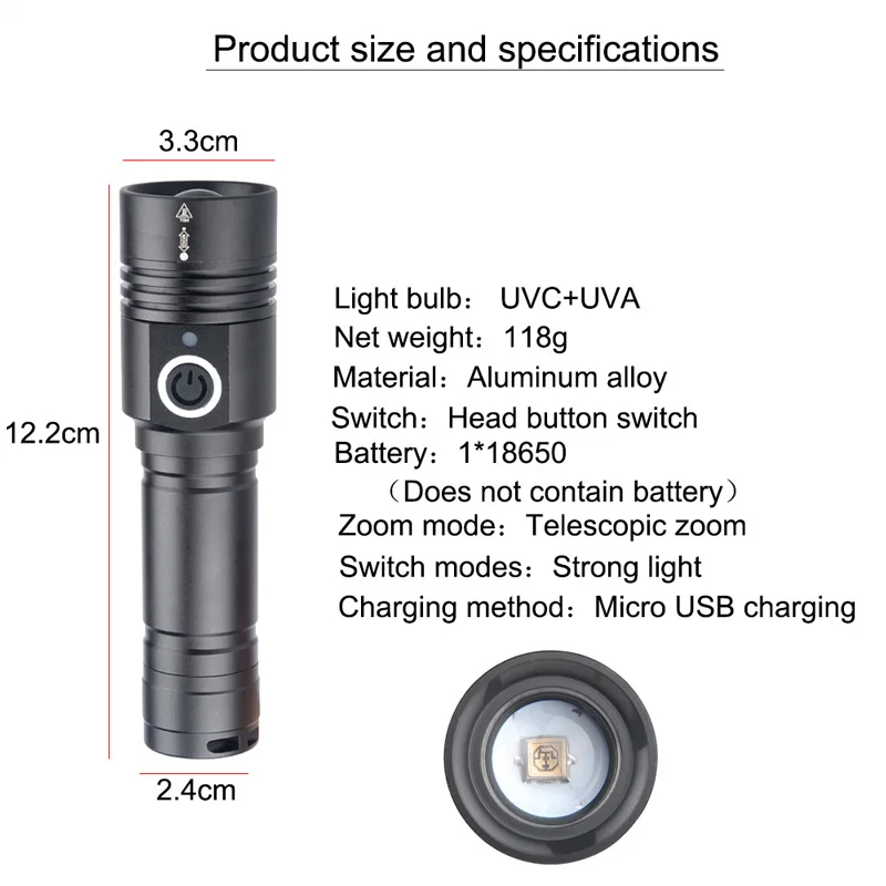 Супер мини-размер, УФ-фонарик. Противоскользящий дизайн и водонепроницаемый дизайн. Регулируемый диапазон фокусировки для различного использования, растяжение для регулировки фокусировки. Зажим для удобства переноски. Рабочее напряжение является широким и может использовать батареи в наибольшей степени. Подходит для охоты, езды на велосипеде, альпинизма, кемпинга и активного отдыха и т. Д.