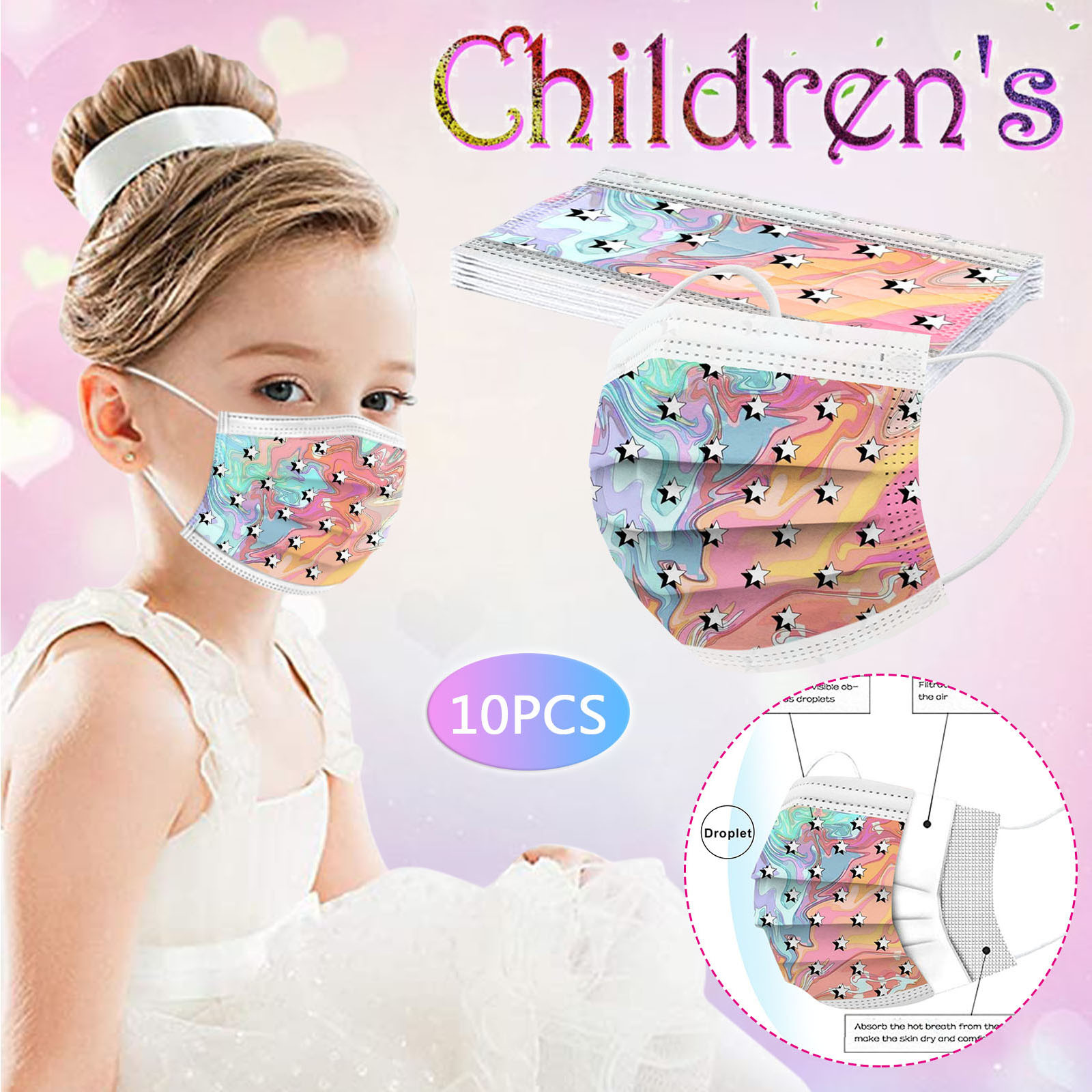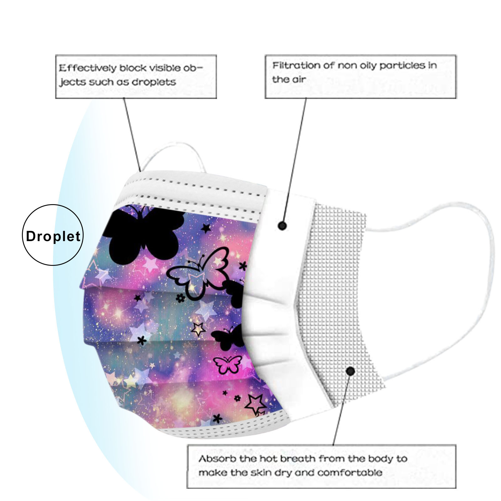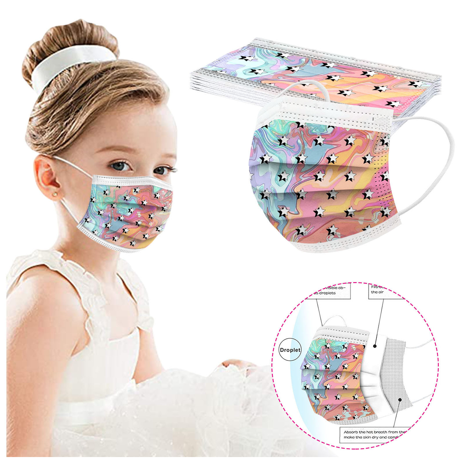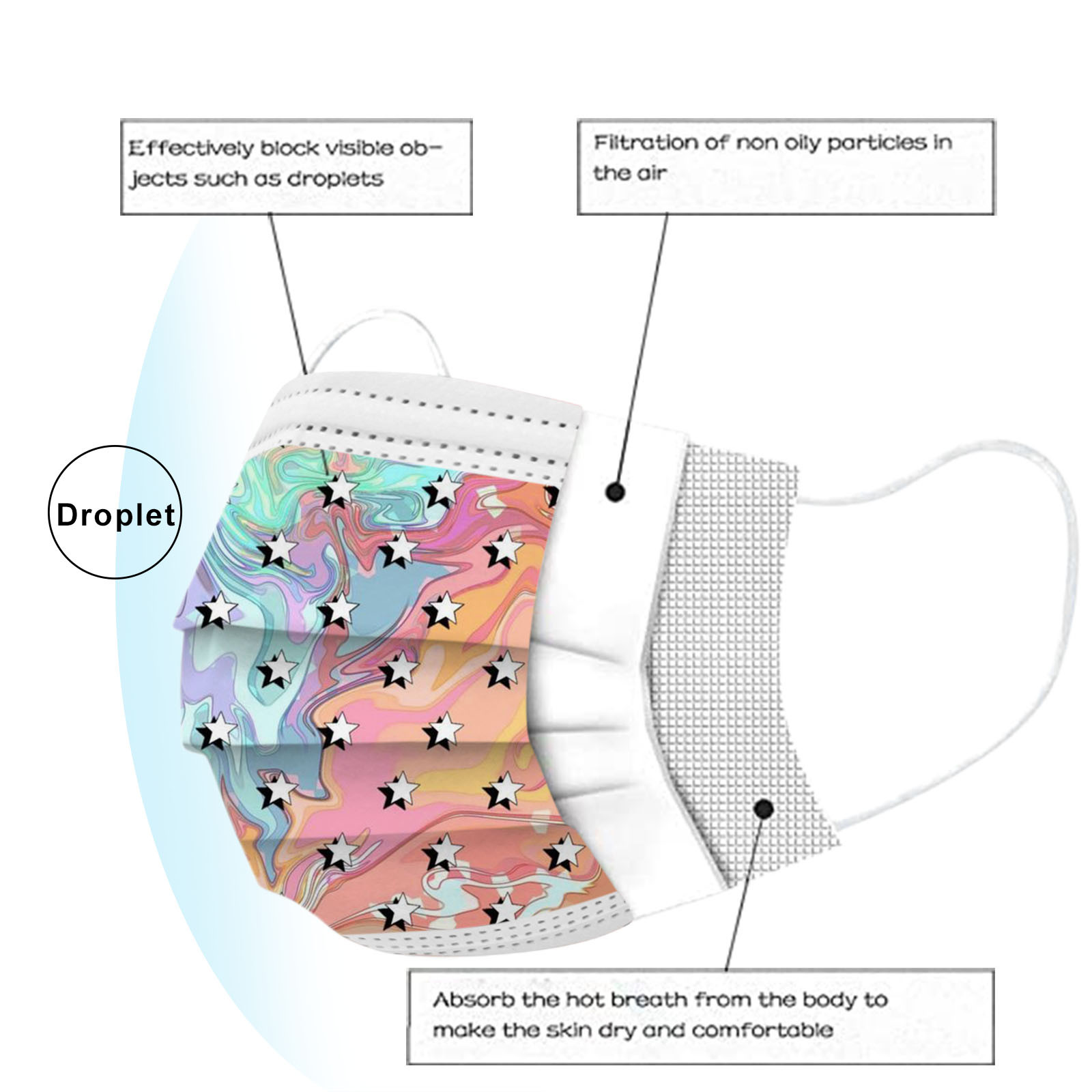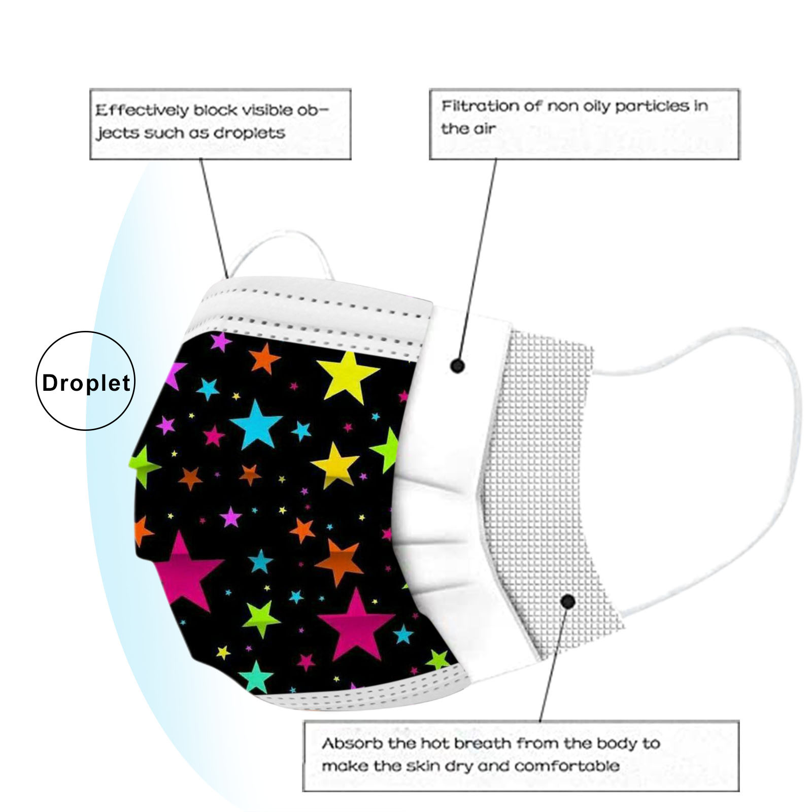 В 3 слоя Нетканая одноразовая маска изготовлена из 3 слоев нетканого материала, Безопасен и безопасен для использования. Дышащий материал и милый Узоры, которые делают его полезным и модным. Специальный 3 слоя из нетканого материала Дизайн, обеспечивает некоторую защиту от пыли, автомобильных выхлопных газов, Пыльца и т. д. эластичная Ушная петля, легко носить и не давит на уши. Маникюрный салон или любые другие области, где может потребоваться защита