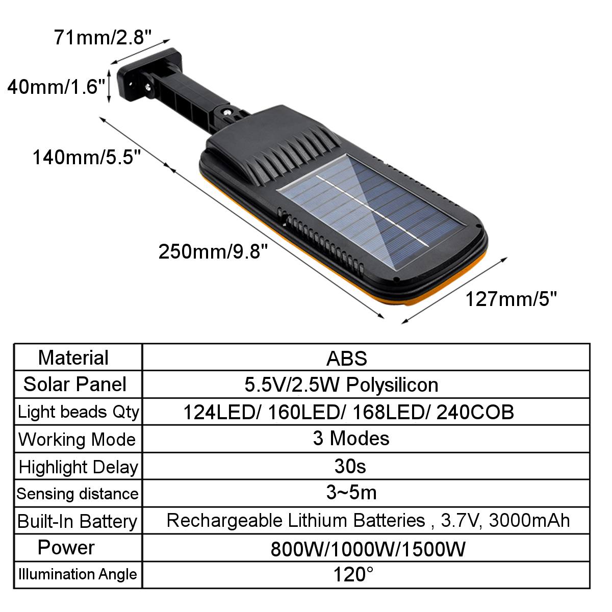 Характеристики: материал ABS Размер 250x12 7 мм/9,8x5 "Солнечная Панель 5,5 V/2,5 W поликремний высокий светильник задержка 30s время работы 12h угол освещения 120 ° люмен 1500/3000/4500LM светильник ing областях 150/300/450 ㎡ светильник с бусинами Кол-во 124LED/ 160LED/ 168LED/ 240COB Мощность 800W/1000W/1500W Батарея встроенный Перезаряжаемые литий-ионный аккумулятор и зарядное устройство 3,7 V, 3000mAh
