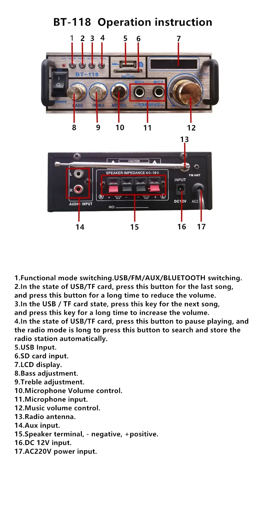 Поддержка sd-карты, u-диска, воспроизведения формата MP3, Поддержка беспроводного подключения Bluetooth.