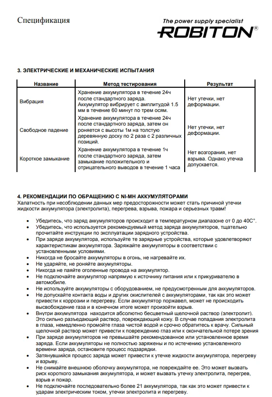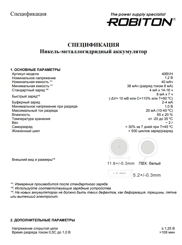 Электро-химическая система: Никель-металлогидридные (Ni-MH)Спецификация: Ni-MH 40BVH 40мАч Блистер-2