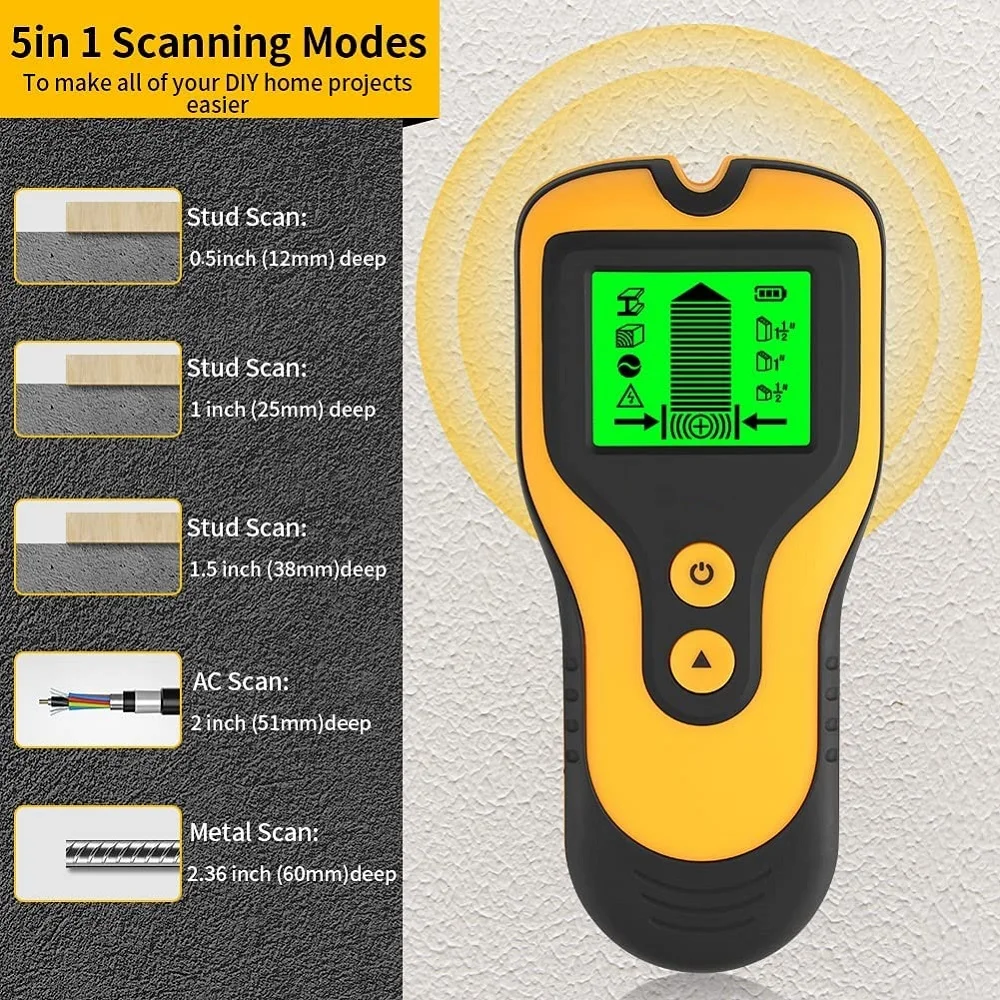 5 in 1 Multi-function Detection: The upgraded 5 in 1 mode provides users with more detection needs. 1.27 cm scan mode locates the center and edges of wood and metal studs up to 1.27 cm deep; medium scan locates the center and edges of wood and metal studs up to 1 inch deep; Deep scan locates the center and edges of wood and metal studs up to 1.5inch deep; Metal scan detects metal (Ferrous and Non-Ferrous Metal) up to 6.0 cm deep; AC scan detects live unshielded AC wires up to 2 inches (about 5.1 cm) deep.
