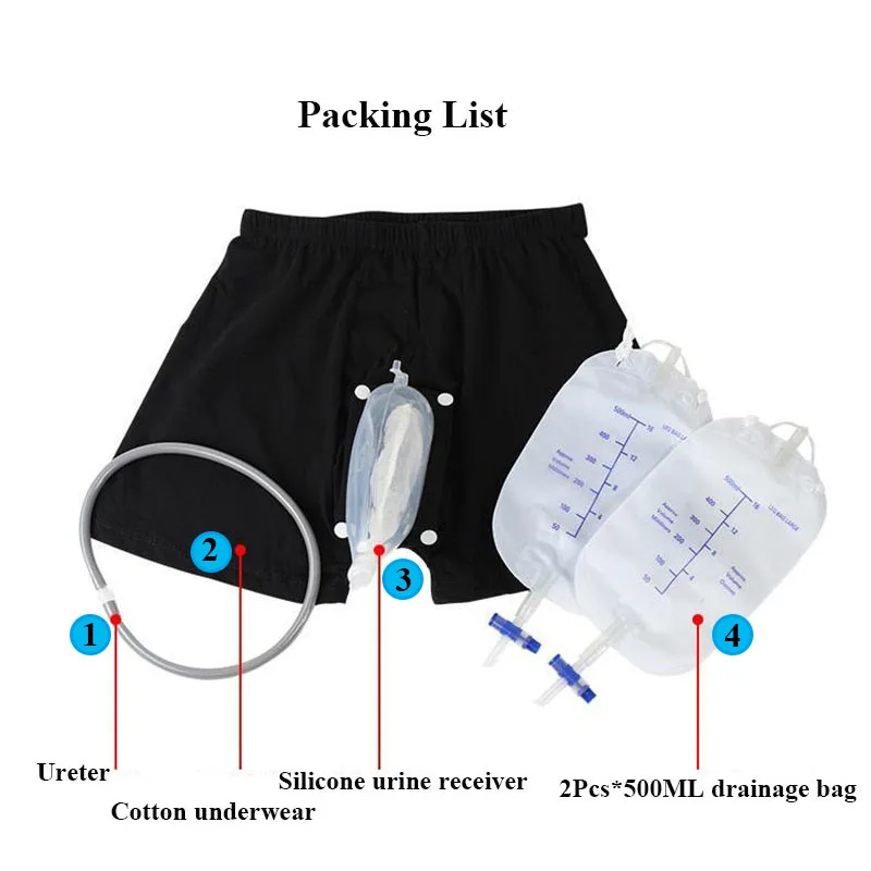 Этот продукт состоит из мочевой воронки, мочевого катетера, двух дренажных мешков, трусиков и ленты для фиксации ног.