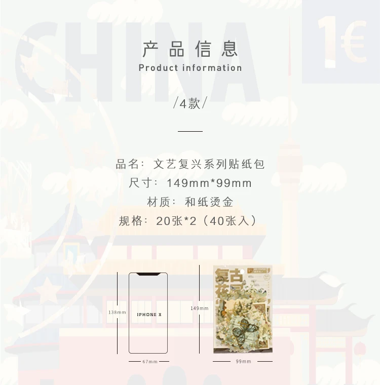 Тип: декоративная наклейка Материал: японская бумага Артикул: 4 вида конструкций Размер: 149*99 мм Количество: 40 листов Вес: 20 г Посылка: посылка Посылка: 20 рисунков * 2