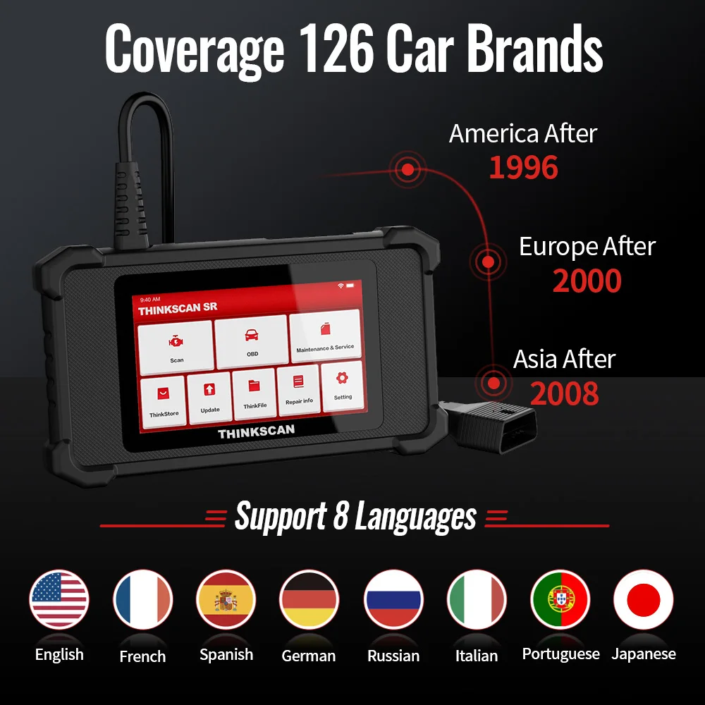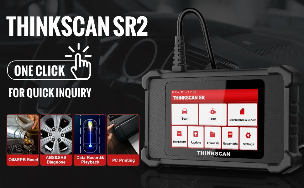 Thinkscan SR2Obd2 сканер обновленная версия диагностического инструмента сканирования, который оснащен большим5 дюймовСенсорный экран,16G RAM, аккумулятор 600mAh, И подходит для транспортных марок 120 + по всему миру, идеально подходит для помещений гаража или авторемонтного магазина. Выберите наш инструмент сканирования, вы получитеПожизненное бесплатное обновление и гарантия 5 лет