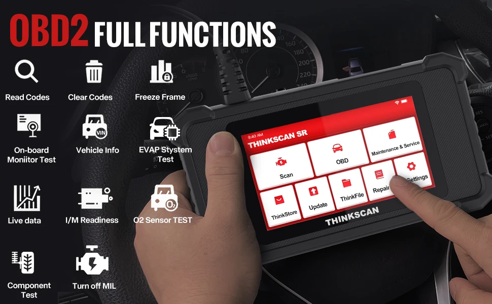 Считыватель кодов автомобиля THINKSCAN SR2 поддерживает полностью OBD2 функции, включая коды чтения/стирания, прямой поток данных, данные о замораживании, состояние готовности I/M, тест на монитор O2, бортовой тест на монитор, проверка компонентов, поиск информации о транспортном средстве.