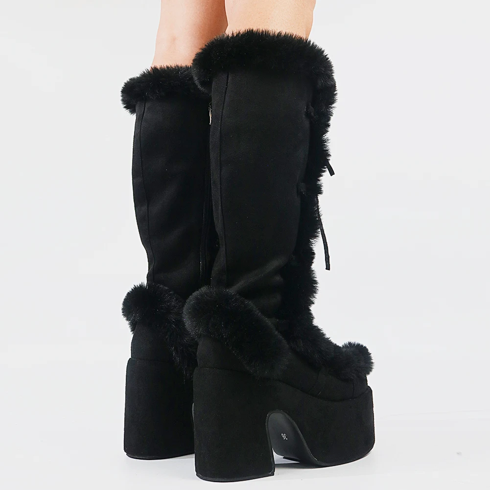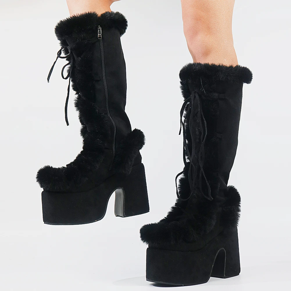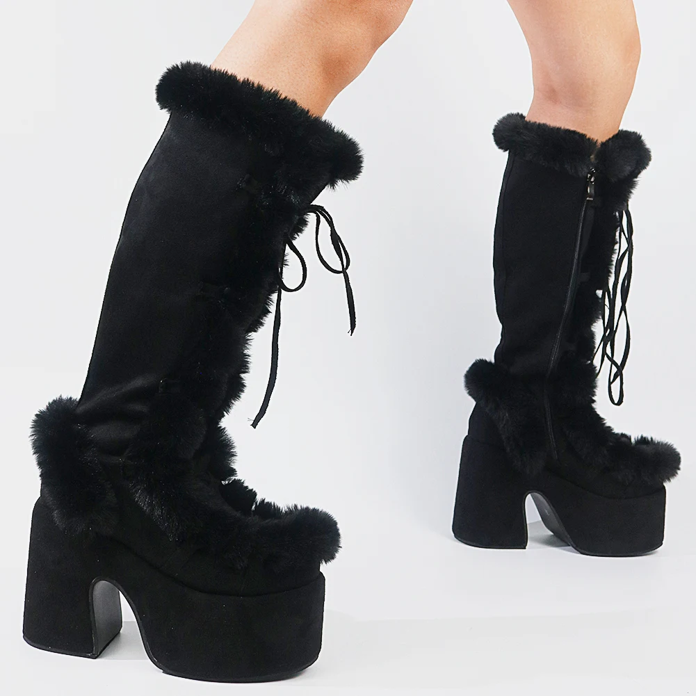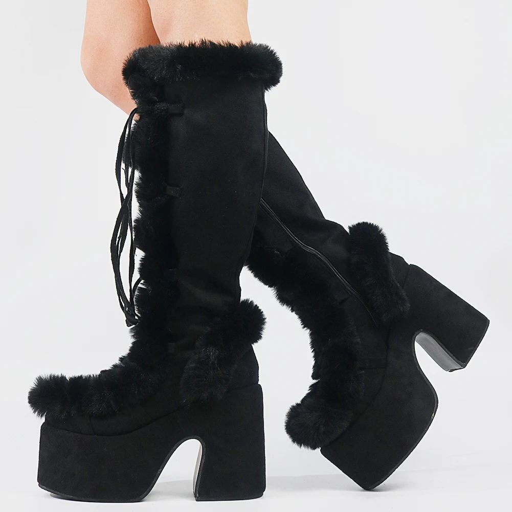 Женские зимние сапоги для женщин; Сезон осень; Модные сапоги на меху с перекрестной шнуровкой; Высокие сапоги на платформе и не сужающемся книзу массивном каблуке; Новинка 2021 года; Брендовая теплая обувь