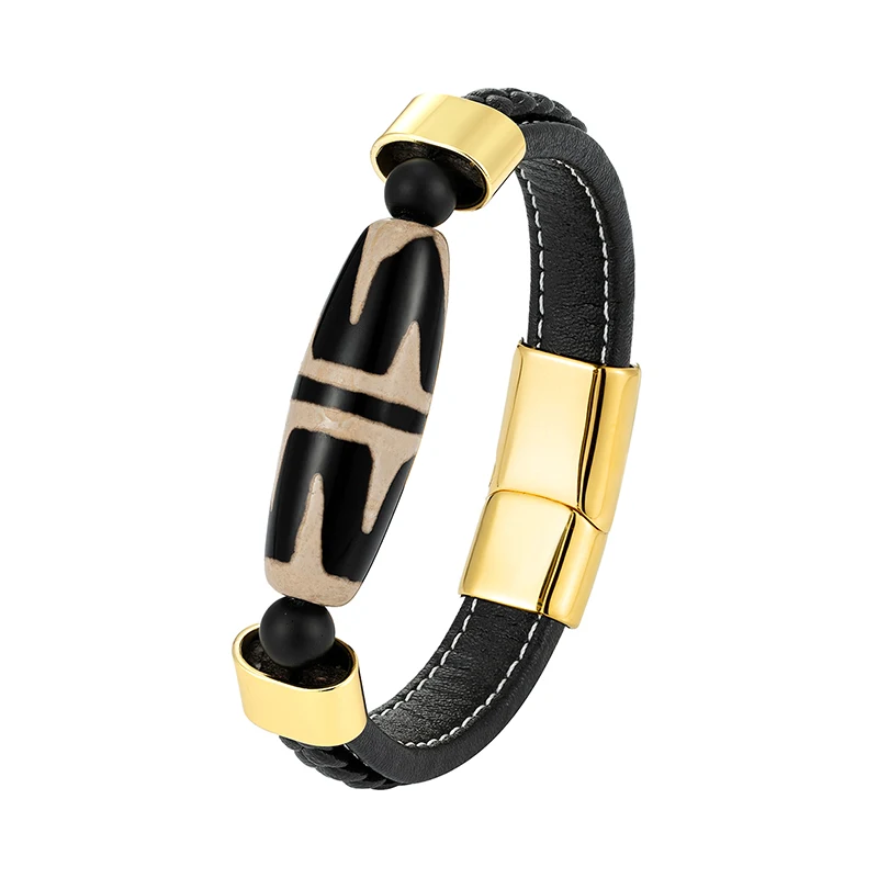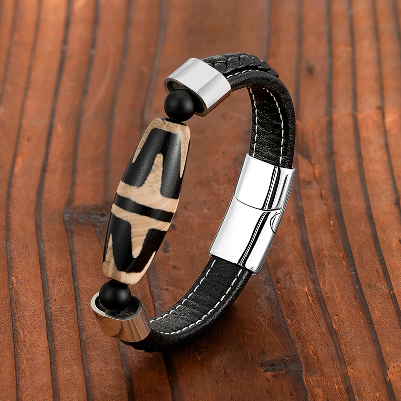 Новинка 2021, тигровый зуб, большой дзи, бусины, натуральный агат, властное ювелирное изделие, мужской браслет 316L, нержавеющая сталь, черный кожаный шнур, браслет