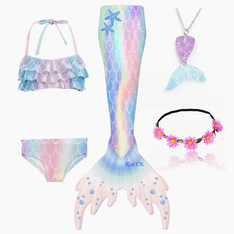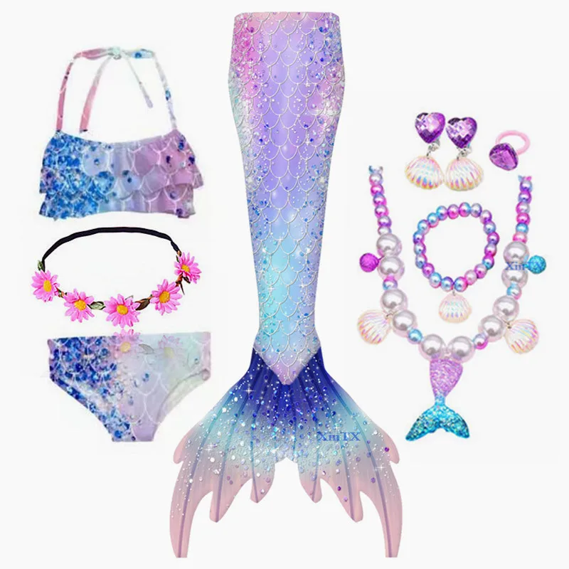 Package 1: 1 *mermaid tail skirt + 1 * bra + 1 * shorts + 1 * fin Monofin + 1 * necklace + 1 * bracelet + 1* ring + 1 pair of ear clips +1*Headwear