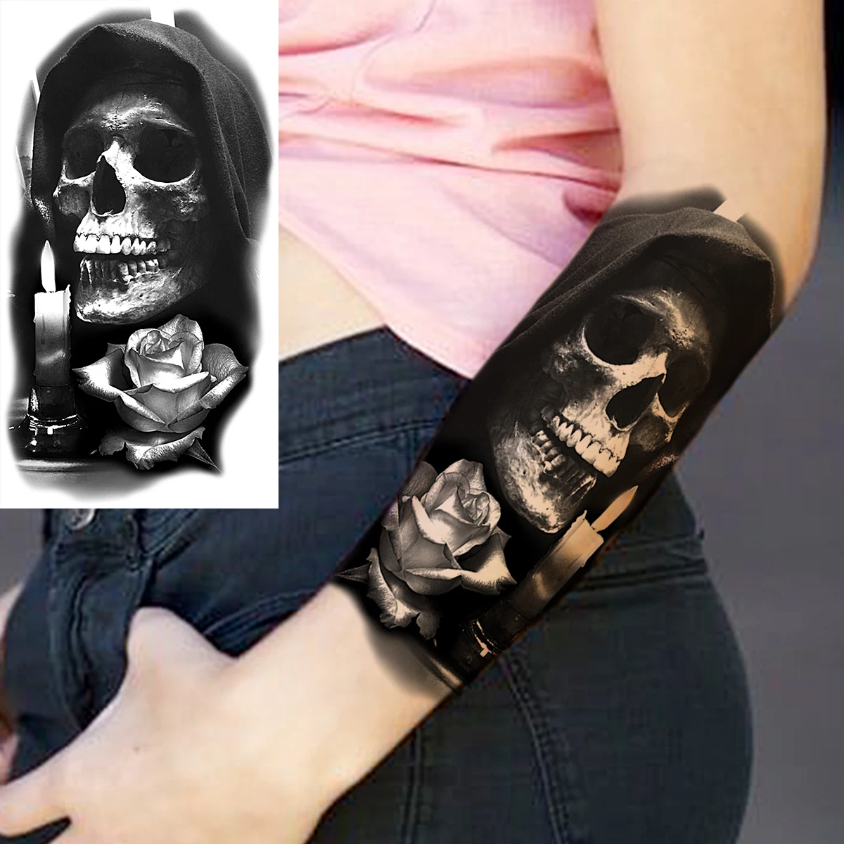 Черный череп Роза цветок корона Временные татуировки для женщин мужчин Лев череп вампир поддельные татуировки реалистичное тело художественное украшение тату