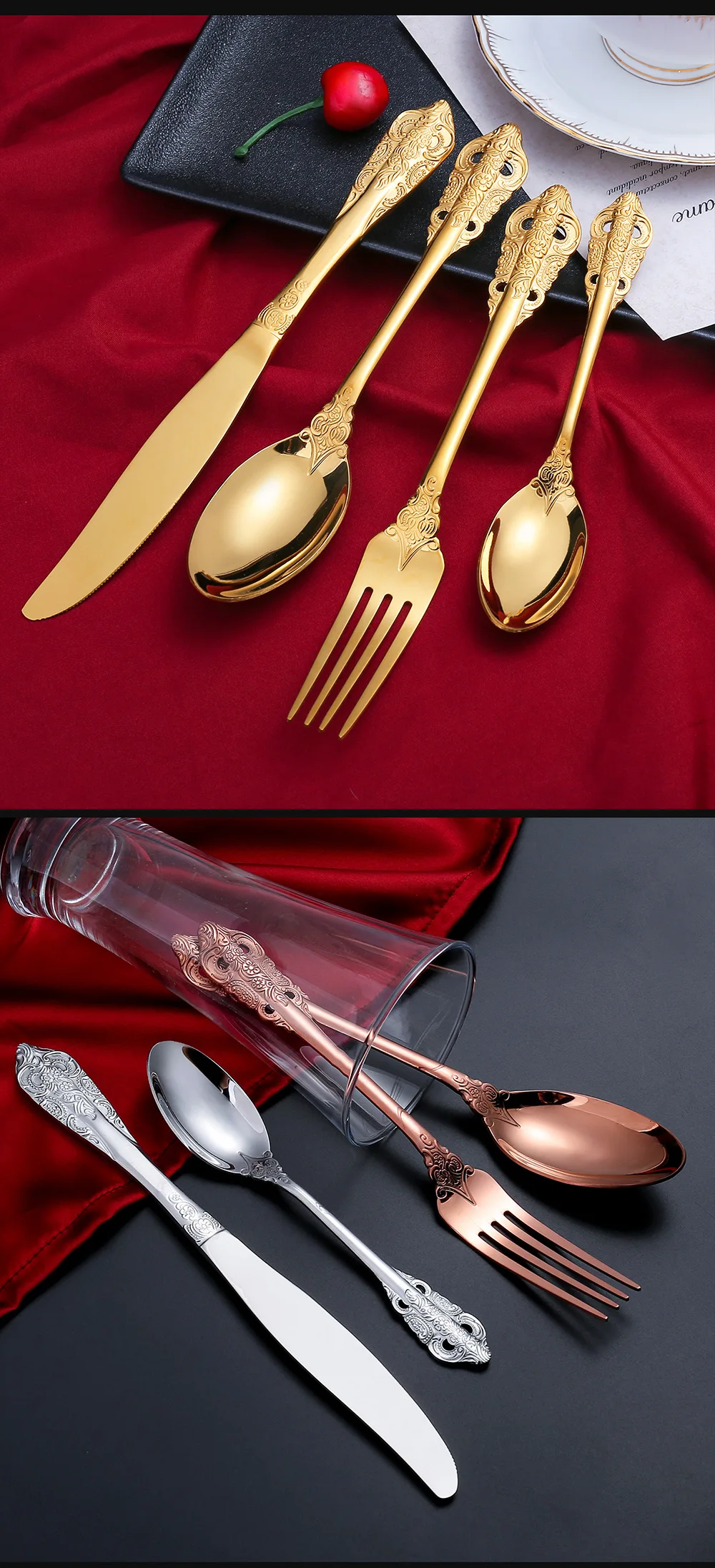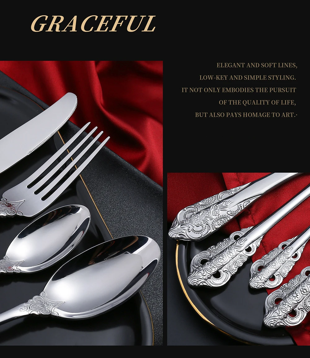 Totally 24 pieces a set, Knife + Spoon + Fork + Tea Spoon.