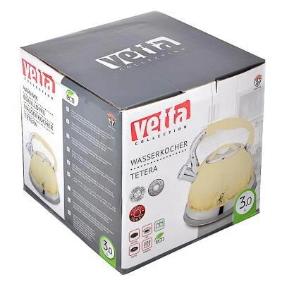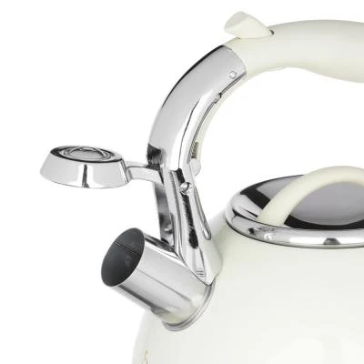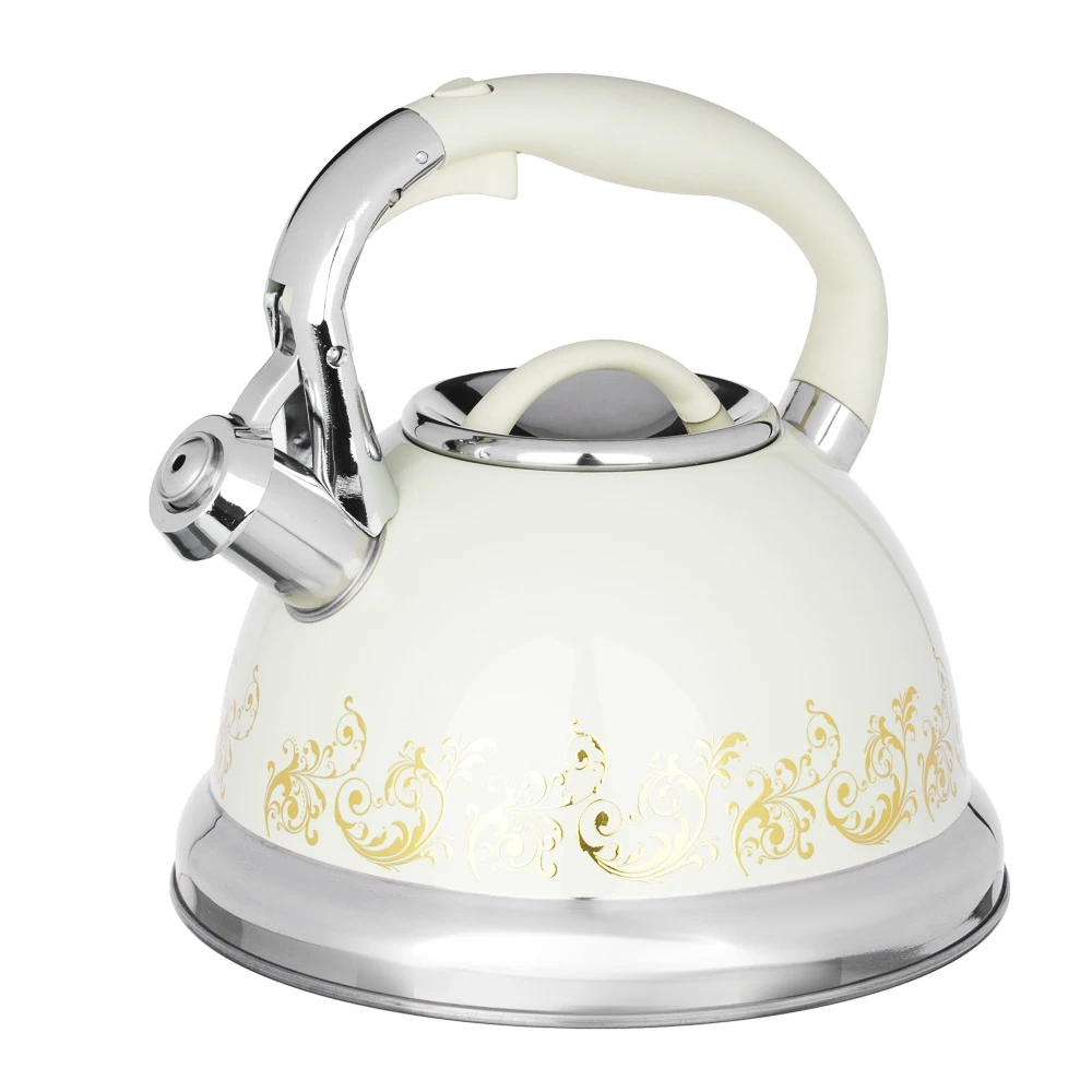 Чайник объемом 3 л изготовлен из нержавеющей стали и имеет привлекательную внешнюю окраску - золотистая вязь на бежевом фоне, оснащен несъемным свистком на кнопке и ручкой из нержавеющей стали с покрытием "софт тач"бежевого цвета, с капсульным дном, подходит для всех видов плит, включая индукционные.
