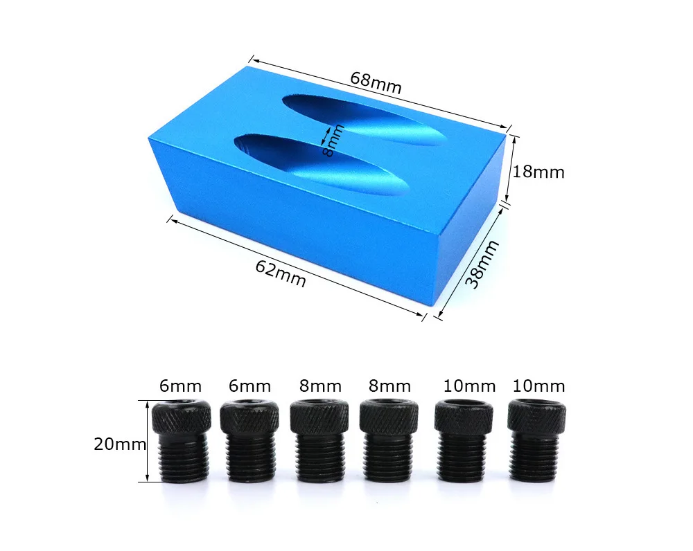 【Более точный и простой в использовании 】 --- направляющее отверстие для сверла имеет точный угол в 15 градусов, что может минимизировать повреждение деталей по дереву с идеальным эффектом. Благодаря трем фиксированным отверстиям 9,5 мм вы можете выбрать два близких друг к другу или два дальше друг от друга, он зажимает более точно и стабильно, нелегко изменить положение отверстий.