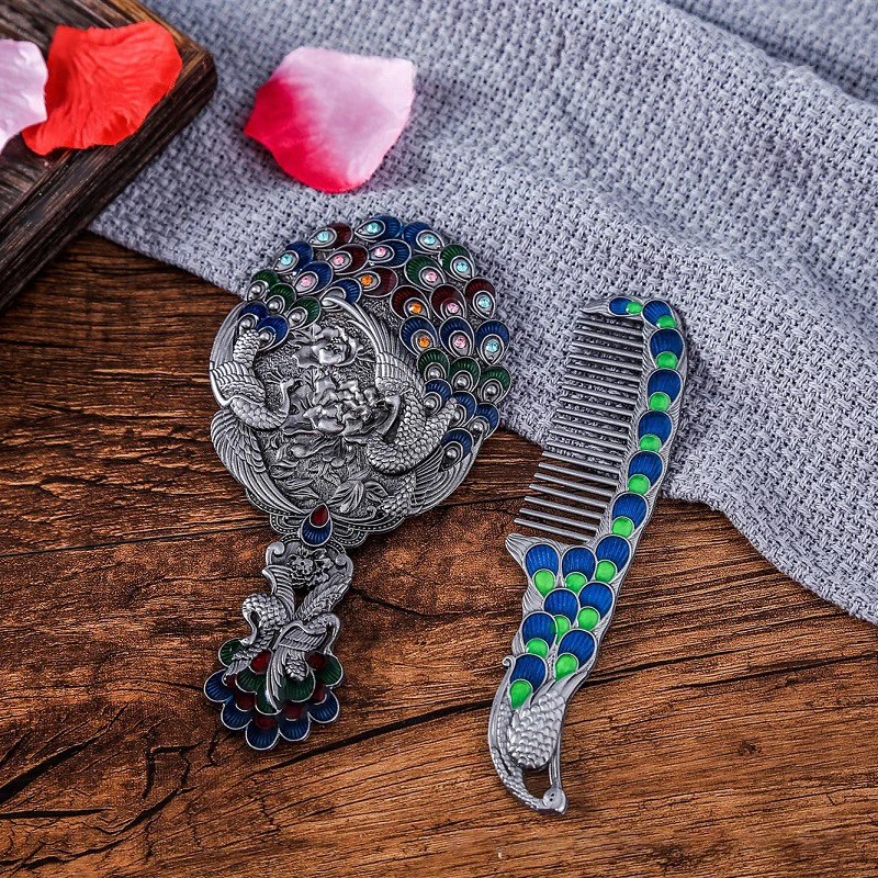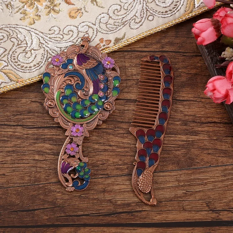 Make Up Mirror Chinese Vintage Hollow-out Carving Rhinestone Mirror Comb Set