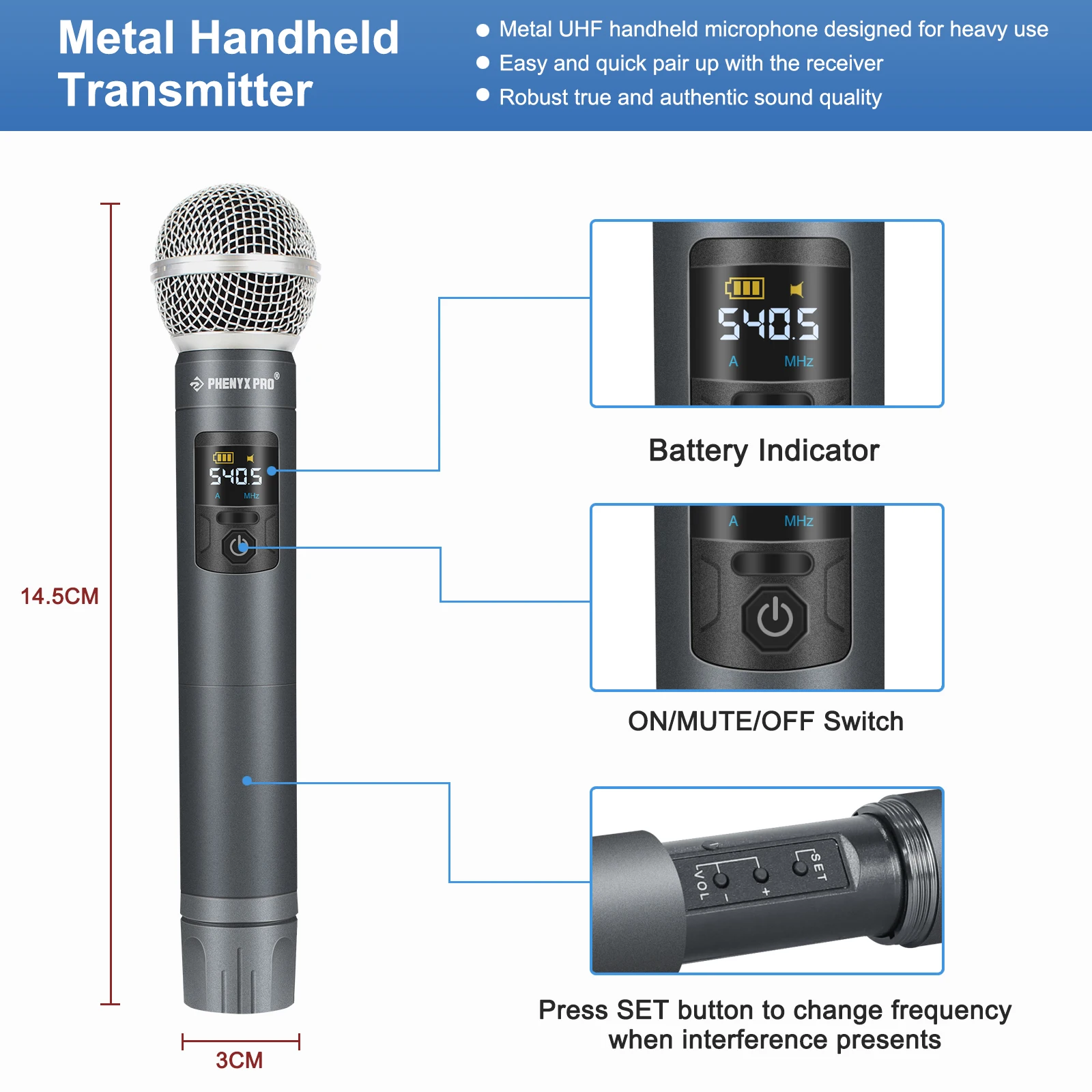 Металлический UHF беспроводной приемник и ручной микрофон предназначены для использования в тяжелых условиях. Боди изготовлен из высококачественных компонентов. Оба ручных и боди оснащены бесшумной функцией для вашего удобства. В комплект входит Твердый чехол для переноски для безопасной транспортировки