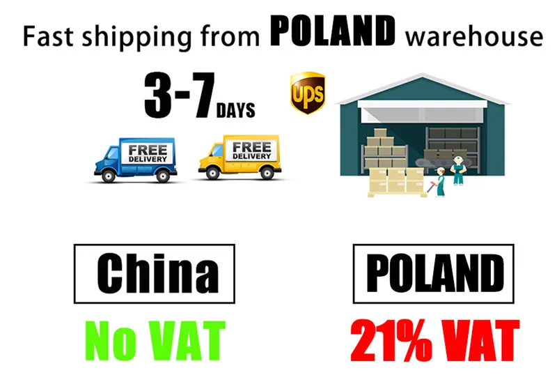Вы можете заказать товары со склада ЕС, отправленные из Китая, без уплаты налогов и НДС. Мы отправим его со склада ЕС, которые могут сэкономить 19% - 30% от стоимости, и вы получите возврат товара должен быть осуществлен в течение 3-7 дней.