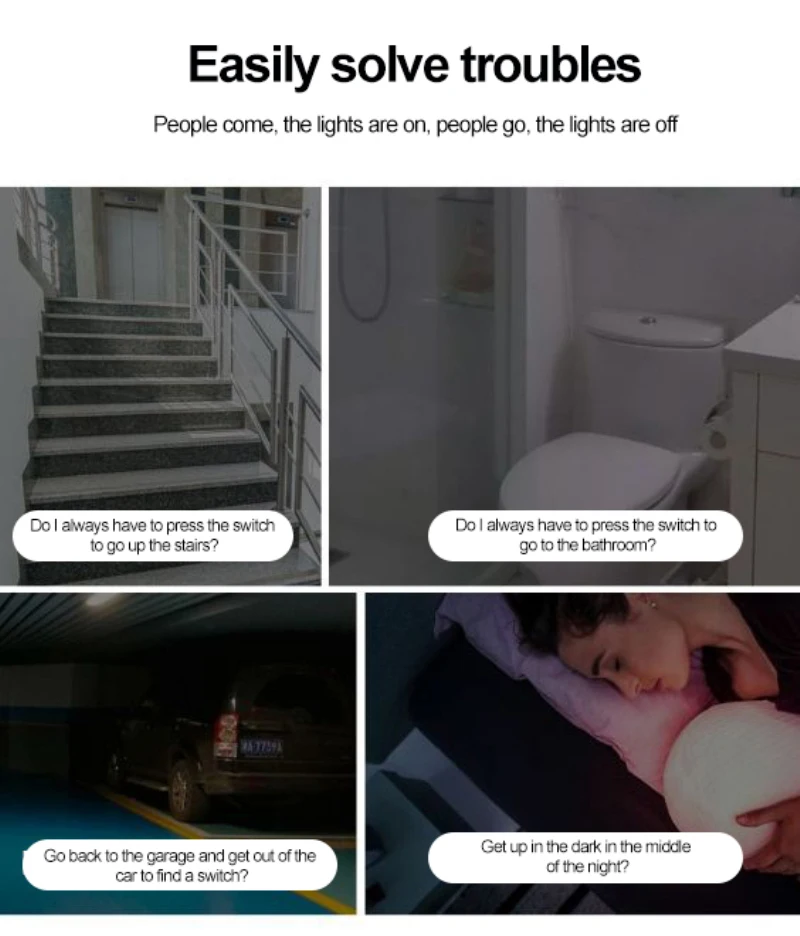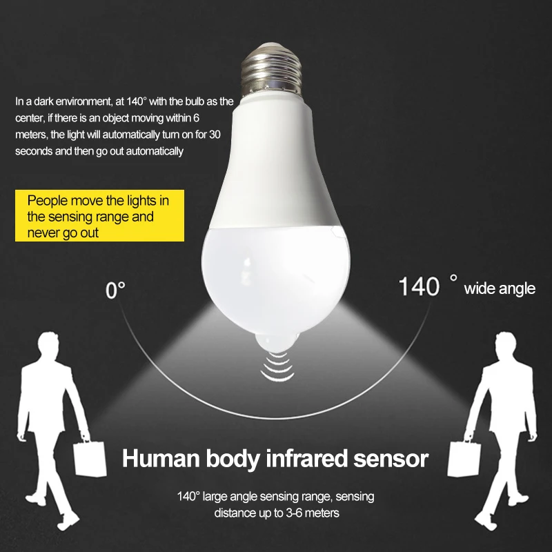 【Датчик движения PIR 】 диапазон широкоугольного зондирования 140 °, расстояние срабатывания 3-6 метров; Когда кто-то движется в пределах чувствительного диапазона, светильник автоматически включается немедленно, И автоматически выключается через 30 секунд