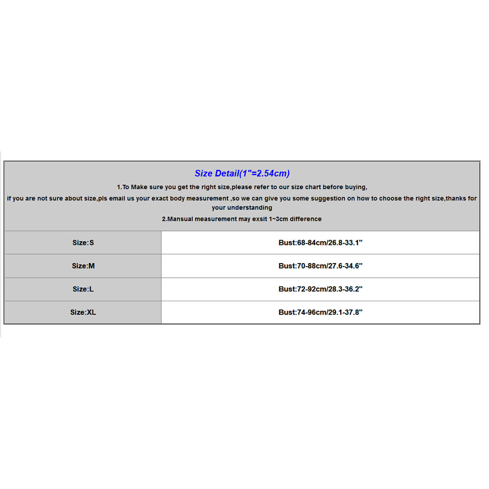Размер: S Бюст: 68-84 см/26,8-33,1" Размер: M Бюст: 70-88 см/27,6-34,6" Размер: L Бюст: 72-92 см/28,3-36,2" Размер: XL Бюст: 74-96 см/29,1-37,8"