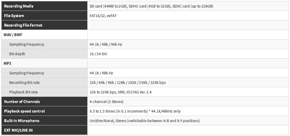 Особенности с первого взгляда:Высококачественные однонаправленные стерео конденсаторные микрофоны, которые могут записывать в A-B и X-YXLR Сделано в Китае/ТРС входов доступно + 4dBu линейный уровень/+ 48V4-х канальный режим, который используется для двойной записи и неразрушающий overdub запись и т. д.Поддержка нескольких языков меню (ENG/FRA/DEU/ITA/ESP/RUS/PRT/JPN/CHI/KOR)Функция перезаписи для записи с одним уровнем отменыРаботает как 2 дюйма/2 выхода USB аудио интерфейс для записи Mac, ПК или iOS Режим диктовки предназначен для записи и записи голоса человекаФункция декодирования MS позволяет использовать M-S микрофоныОпционально RC-3F переключатель ноги и RC-10 проводной пульт дистанционного управления может быть подключенДолгое время работы максимум 18 часов возможно с использованием только внутренних батарейЭффект реверберацииФункция автоматической записиПроверенная конструкция высокого звукового давления для захвата громких звуков до 125 дБ SPLФункция пикового уменьшения, которая обнаруживает пики и автоматически устанавливает оптимальный уровень Функция самостоятельной записи таймераБесшовный Контроль усиленияНизкочастотным фильтром-с тремя уровнями Нью-Йорк (40/80/120 Гц)Скорость изменения (VSA) функция регулировки Скорость от 0,5 до 1,5 раза (в 0,1 с шагом повышения напряжения)Функция выравнивания уровня, которая предотвращает неравномерный уровень громкостиНастройка эквалайзера для регулировки качества воспроизведения звукаРазделение/удаление функцийФункция циклического/повторного воспроизведения, которая подходит для занятий музыкой и изучения языковФункция Resume, которая сохраняет Последнее положение стоп и начинает воспроизведение с этой позиции, когда питание включено Функция воспроизведения, которая пропускает заданное количество секунд во время воспроизведенияКнопка быстрого меню для легкого доступа к различным функциямВысокое качество 24 бит/96 кГц WAV/BWF линейный PCM и MP3SD/ SDHC/ SDXC (до 128 ГБ) используется для записиФункция отметки, которая может настроить до 99 точек для одного трекаАудио файлы, созданные на компьютерах, можно воспроизводить (только в форматах, совместимых с этим продуктом)Встроенный монауральный динамик с выходной мощностью 0,3 WБуфер предварительной записи, который может записывать до 2 секунд до начала записиПри достижении предопределенного максимального размера файла для продолжения записи создается новый файлУвеличение трека создает новые файлы в произвольных местах во время записиФормат имени файла может быть установлен для использования пользовательского слова или даты Первые шесть символов имени файла для записи можно установить свободноФункция плейлистаХроматический тюнер оснащен, что полезно для практики музыкальных инструментовСтерео мини линия выход/выход наушников разъемГрафический ЖК-дисплей 128 × 64 пикселей с подсветкойВысокоскоростная передача файлов на компьютер с помощью USB 2,0Питание от 3 батареек AA, питания USB шины или дополнительного адаптера переменного тока (PS-P520E)Резиновые ножки для улучшения акустических свойств во время настольных записей включеныКрепление штатива винт-отверстие встроенный в блок