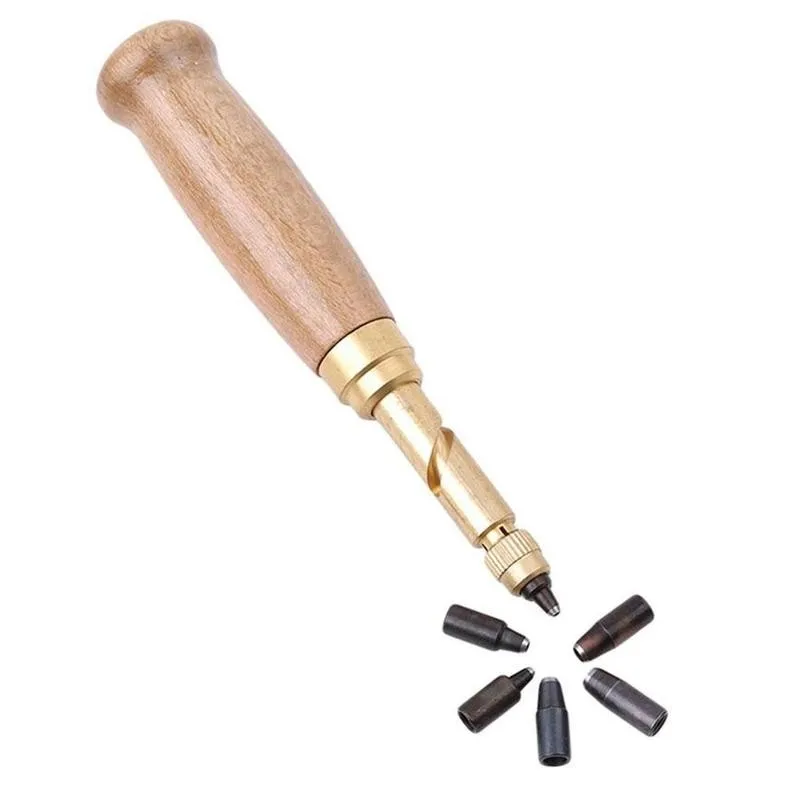 Fix the leather, the hole punch is 90 degrees perpendicular to the leather surface, and press the handle at the desired position to punch holes (if the leather is thick, you need to repeat it several times).