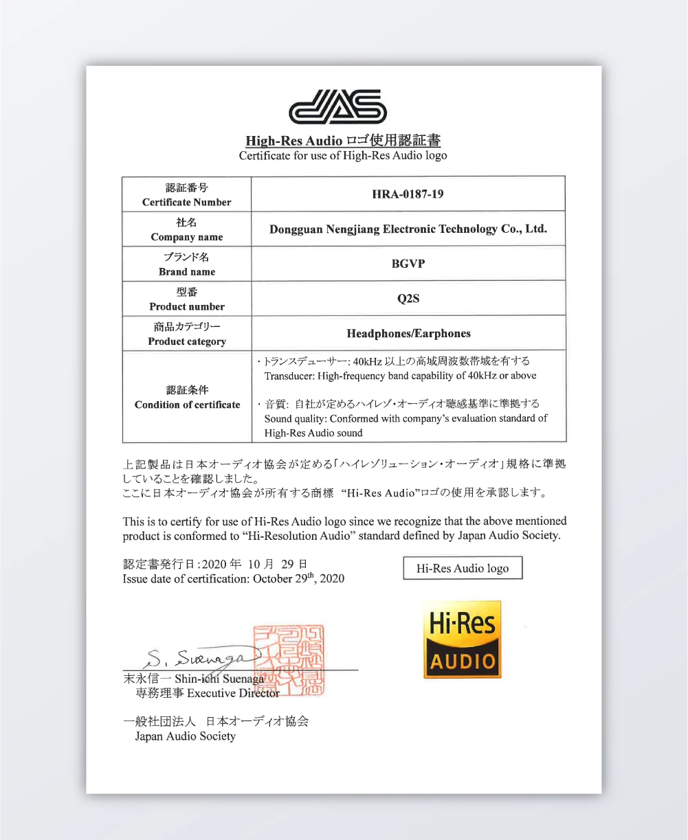 Q2s получила сертификацию «Hi-Res Audio» японской аудиоассоциации.