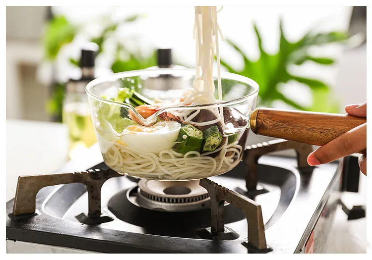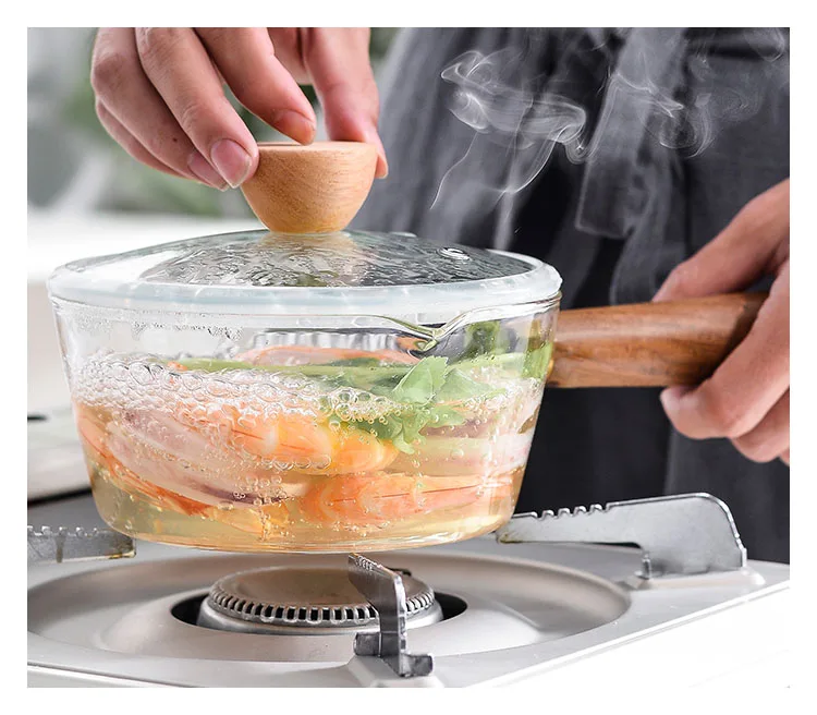 Glass Wooden Handle Milk Pot Household Baby Food Can Open Fire Hot Milk Noodle 400ml Pot Transparent Fruit Stew Pot Cookware