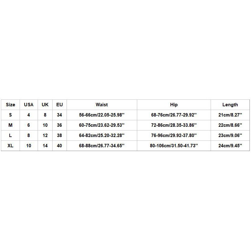 Размеры США Великобритания ЕС Талия Бедра Длина S 4 8 34 56-66 см/22,05-25,98'' 68-76 см/26,77-29,92 дюйма 21 см/8,27'' М 6 10 36 60-75 см/23,62-29,53'' 72-86 см/28,35-33,86'' 22 см/8,66'' L 8 12 38 64-82 см/25,20-32,28 дюйма 76-96 см/29,92-37,80'' 23 см/9,06'' XL 10 14 40 68-88 см/26,77-34,65'' 80-106 см/31,50-41,73'' 24 см/9,45''