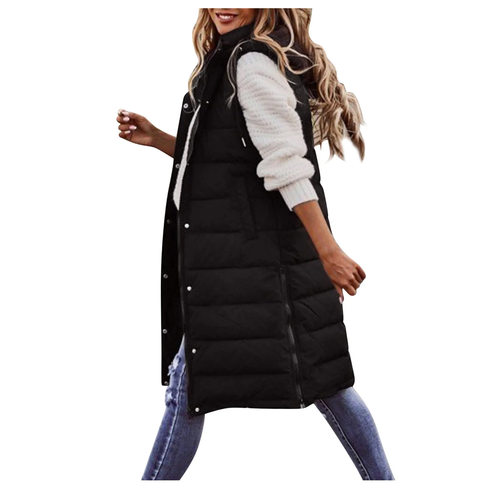 Женское длинное зимнее пальто, жилет с капюшоном, без рукавов, теплый пуховик с карманами, стеганый жилет, пуховик, стеганая куртка для улицы