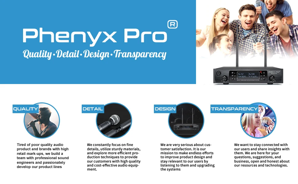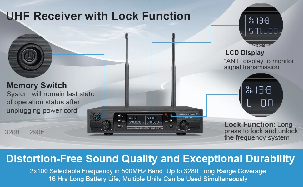 Высококачественная Беспроводная Производительность:Двойная UHF Беспроводная микрофонная система с выбираемой частотой.
