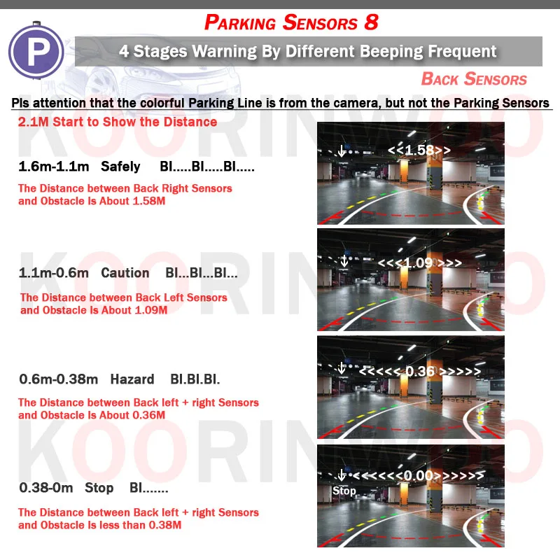Может быть подключен к камере и любому монитору заднего вида и отображать расстояние на мониторе