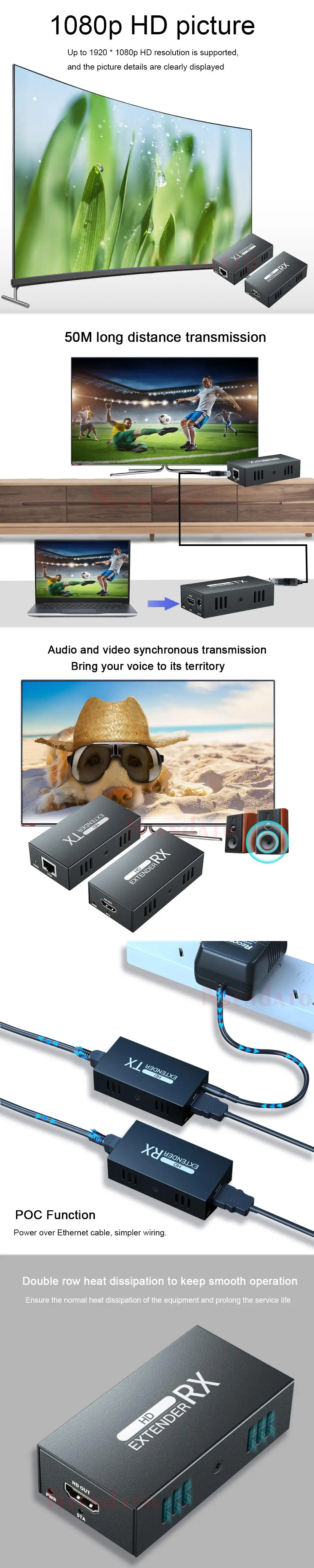 Transmits HD video and audio signals up to 50M over a single CAT6 cable;