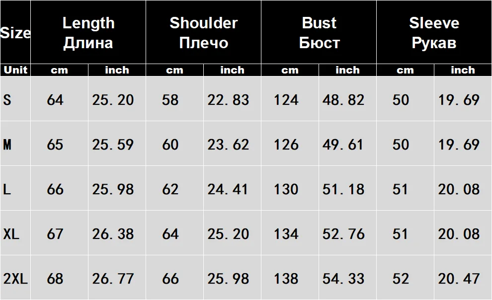 L: Длина: 66 см/25,98 дюйма, ширина плеч: 62 см/24,41 дюйма, обхват груди: 130 см/51,18 дюйма, длина рукава: 51 см/20,08 дюйма;
