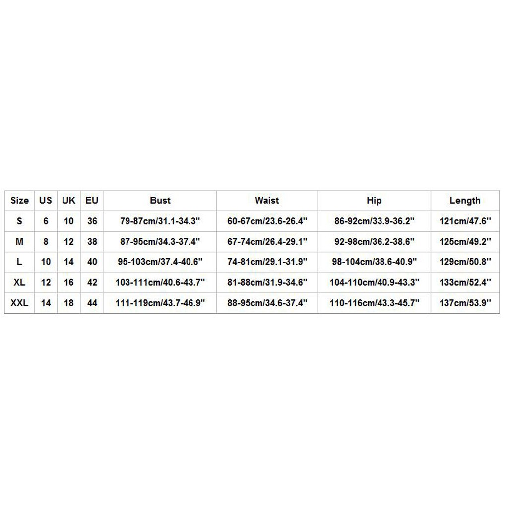 Размеры США Великобритания ЕС Бюст Талия Бедра Длина S 6 10 36 79-87 см/31,1-34,3" 60-67 см/23,6-26,4" 86-92 см/33,9-36,2" 121 см/47,6'' М 8 12 38 87-95 см/34,3-37,4" 67-74 см/26,4-29,1" 92-98 см/36,2-38,6" 125 см/49,2'' L 10 14 40 95-103 см/37,4-40,6" 74-81 см/29,1-31,9" 98-104 см/38,6-40,9" 129 см/50,8'' XL 12 16 42 103-111 см/40,6-43,7" 81-88 см/31,9-34,6" 104-110 см/40,9-43,3" 133 см/52,4'' XXL 14 18 44 111-119 см/43,7-46,9" 88-95 см/34,6-37,4" 110-116 см/43,3-45,7" 137 см/53,9''