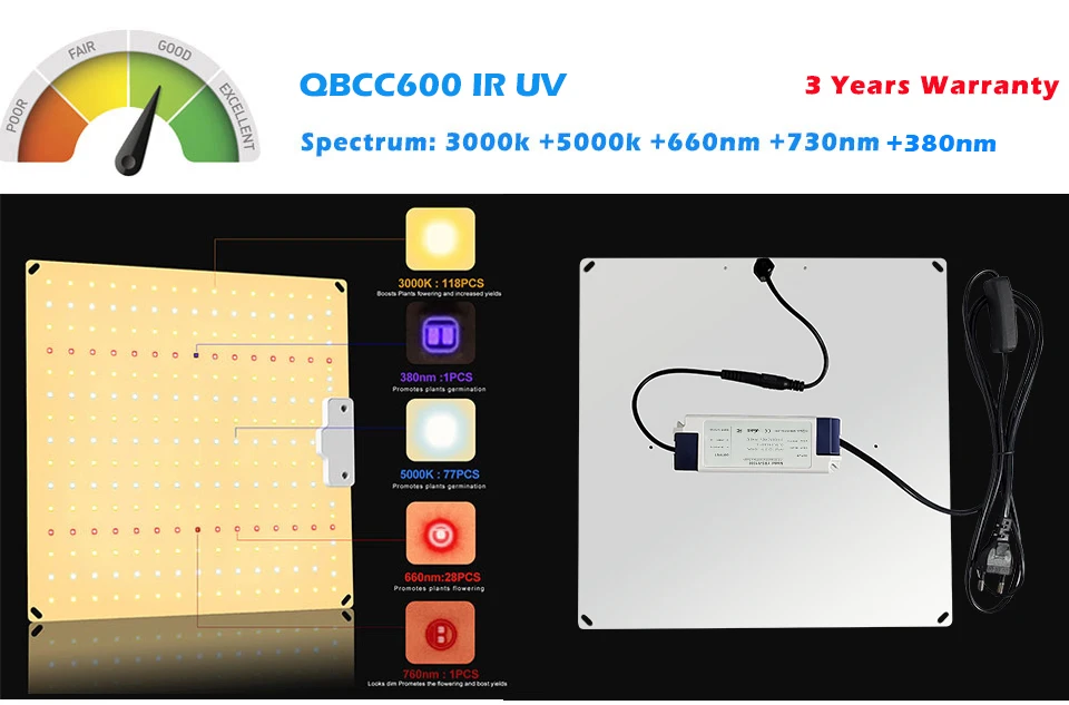 QBCC600 output wattage is 50W-55W,we choose samsung leds with high lumn&ppdf,We suggest use it for seeding cultivation stage .If your growing area only 3x3ft,you can use 600W led grow light from seeding to blooming stage.